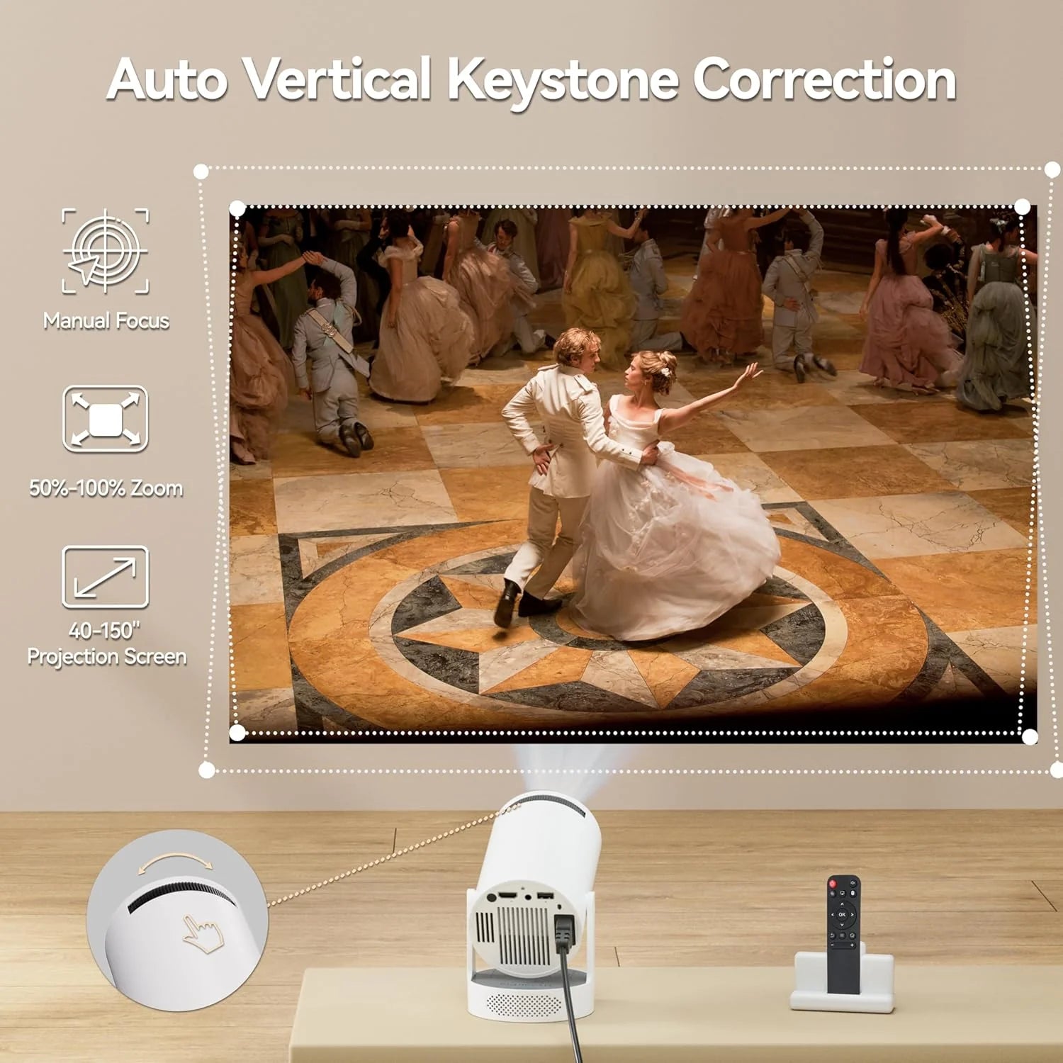 The 210° rotating bracket allows projection onto walls, ceilings, or the floor, while the short-throw lens delivers a 100" screen from just 2 meters. Flexible viewing from any angle is supported through manual focus, vertical auto keystone, and ±15° horizontal correction—ensuring a perfectly aligned image every time.